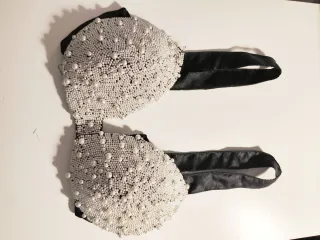 Corpiño adornado con perlas blancas y detalles negros. Tirantes de satén negro. Talla 38 Prácticamente nuevo.