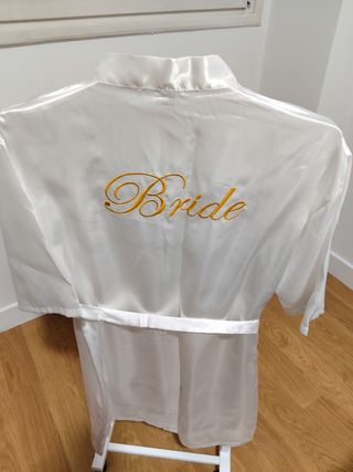 Elegante bata blanca con detalles dorados, perfecta para la novia. -usado solo el día de la boda - Bordado Bride con corona dorada. - Cinturón a juego para ajustar. - Tejido satinado suave.