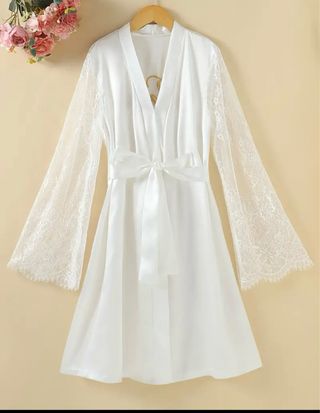 Elegante bata lencera de novia. Usado una vez un ratito en las fotos de antes de ponerse el vestido de novia. Cada pieza costó 70€. Si se compran las dos (bata y camisón) lo dejo en 100€ y las zapatillas de Zara Home talla 38 de regalo. - Diseño delicado con encaje. - Cinturón para ajustar. - Tejido ligero y vaporoso.