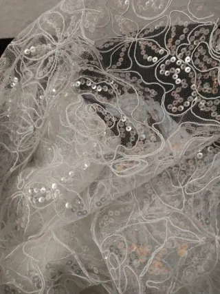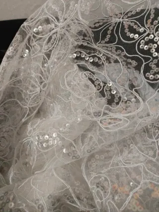 Preciosa tela de encaje con un diseño floral intrincado y lentejuelas brillantes. - elegante para confección de vestidos de novia. - Diseño floral blanco. - Lentejuelas plateadas y transparentes. - Tejido de malla delicado. - El precio es por metro de tela, preguntar para otras cantidades. - No se aceptan devoluciones -