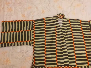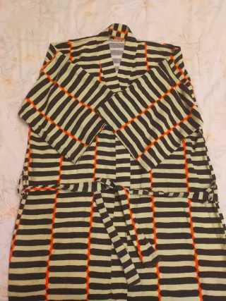Bata estilo kimono de Ikea, cómoda y con un diseño llamativo. - Estampado de rayas negras y naranjas sobre fondo claro. - Manga ancha.