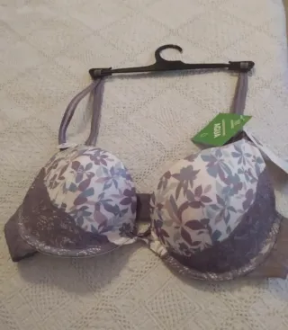 Sujetador con un bonito estampado floral y detalles de encaje. - Diseño con aros. - Tirantes ajustables. - Cierre de corchetes en la espalda.