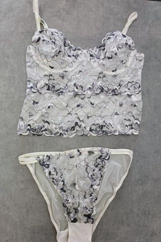 Conjunto de lencería con un diseño de encaje color gris claro y gris oscuro. - Encaje floral gris. - Aros. - Tirantes ajustables. - Talla: 80B y braguita 42 - Delantera: material 82% poliamida 18% elastán, bordado 100% viscosa - Trasera: red 86% poliamida 14% elastán.