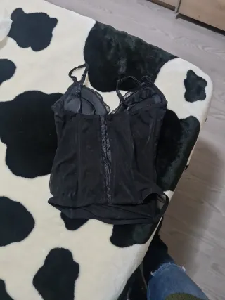 Elegante bustier negro con detalles de encaje. - Diseño con copas. - Tirantes ajustables. - Cierre en la espalda.