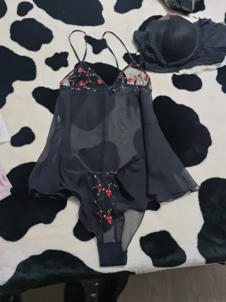 Conjunto de lencería de 3 piezas. A ESTRENAR Camiseta negra de lycra con encaje en el escote. - Pantalones cortos con estampado de lunares blancos. - Pantalones cortos lisos. - Detalle de encaje en los bordes. Se entrega en persona Visita mi página para ver otras ofertas