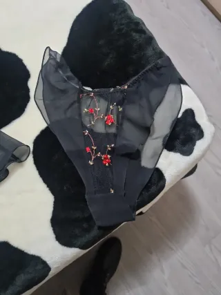 Conjunto de lencería negro con detalles de encaje y bordado floral. - Tejido transparente. - Adornos florales en rojo.