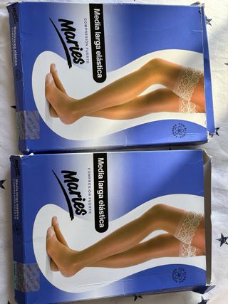 Par de medias largas de compresión con un diseño elegante. - Con banda de encaje. - Compresión fuerte.
