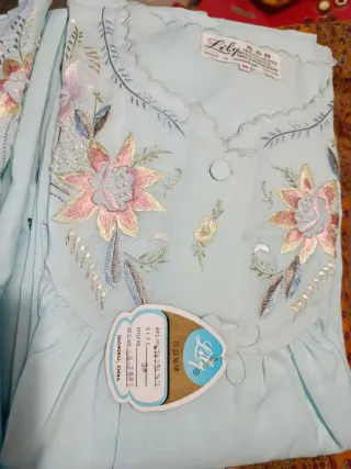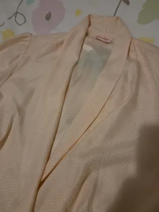 Conjunto de camisón y bata. - Tejido de punto texturizado. - Cierre con lazada de satén en el escote. - Diseño largo y elegante. - No talla muy grande, mejor comprobar medidas con las fotos. - Nunca usado pero se ha lavado porque llevaba tiempo guardado.