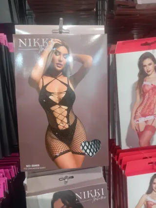 Conjunto de lencería de la marca Nikki Intimo. - Diseño de encaje con detalles plateados. - Estilo body. - Talla única.