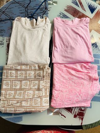 Conjunto de dos pijamas algodón cómodos y de talla grande XXXL - Un pijama es de color beige con un estampado de palmeras en cuadros. - El otro pijama es de color rosa con un estampado de sellos y lazos.