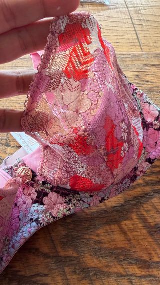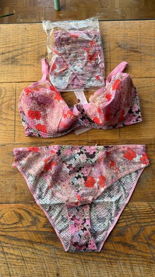 Conjunto de lencería a juego (sujetador + 2 braguitas) sin usar con etiquetas de Savage X Fenty en encaje floral rosa/multicolor. Suave, elástico y muy favorecedor. Braguitas incluidas: una talla L y una XL (tallan muy parecido). Sujetador talla ES/FR 95D Nuevo, sin usar, con etiquetas.