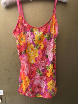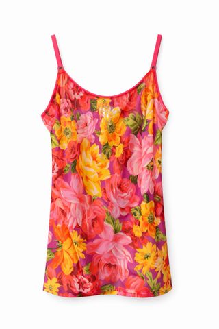 Preciosa lencería con un vibrante estampado floral. - Diseño con tirantes ajustables. - Detalle de pedrería en forma de corazón en el pecho. - Tejido ligero y fluido.