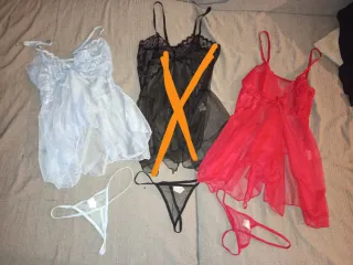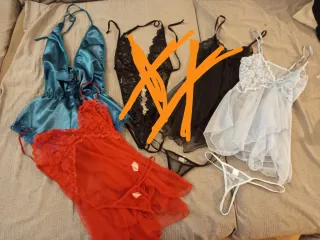 Conjuntos de lencería compuesto por varias piezas. Nuevos a estrenar. Cada uno a 12€, descuento si se llevan más de 1. - Incluye un body de satén azul,( talla L) - Conjunto de tul rojo y azul ( Talla única)