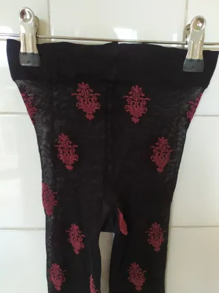 Medias de rejilla fina con un bonito estampado de terciopelo. Con refuerzo. Nuevas sin uso y en perfecto estado. - Color base negro. - Estampado en tono borgoña. - Talla XS/S - Medidas: cintura (elástica): 23 a 36cms, largo: 90cms, alto cintura elástica: 4cms.