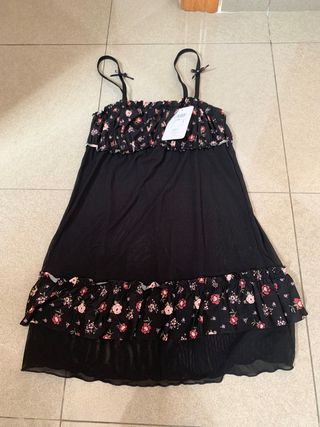 Conjunto de lencería para mujer nuevo sin estrenar. Incluye camisón y tanga. Talla S. Incluye caja original y etiquetas. Perfecto para una ocasión especial. Negro con detalles florares. Marca: Promise luxury. Tiene detalles de lazos y fruncidos.