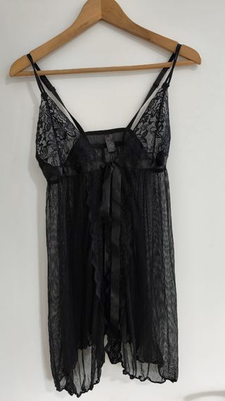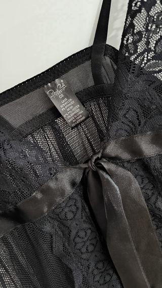 🛍️Vestido lencero negro, copas con aros y falda con transparencias. Muy sexy, los lazos blancos le dan un toque dulce y romántico. No tengo más información sobre la copa, pero diría que es una B.😊 〰️MATERIALES〰️ 🔸84% Poliamida 🔸12% Elastano 🔸4% Poliéster 〰️MEDIDAS〰️ 🌸 Largo: Por encima de la rodilla