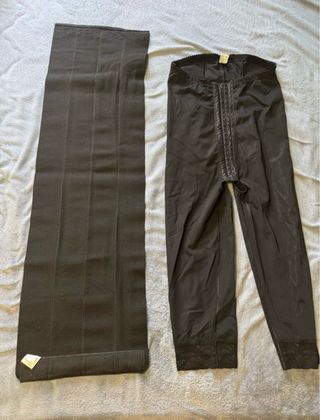 Ambos son de tejido fuerte y elástico. La faja cubre parte de las piernas y es de cintura alta con ballenas. Medidas de la faja: - Cintura: 31 cm, estira hasta 48 - Cadera: 33 cm, estira hasta 56 - Largo: 49 cm Medidas del sujetador: - Contorno bajo pecho: 32 cm, estira hasta 50. - Contorno de pecho: 36 cm, estira hasta 60.