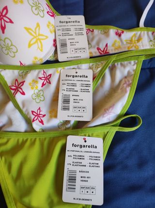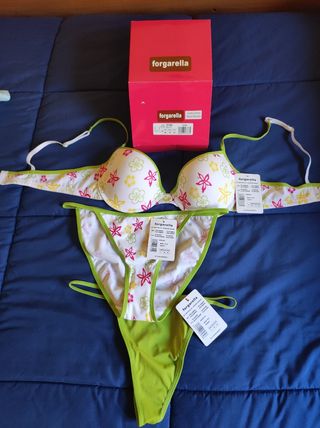 Conjunto formado por 1 sujetador talla 90 B, 1 braga talla M y 1 tanga talla M. En su caja original, con etiquetas y SIN ESTRENAR.