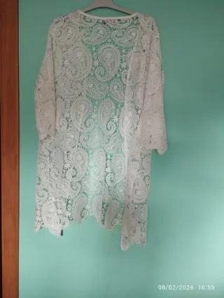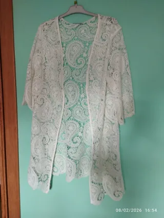 Elegante blazer de encaje blanco con un delicado diseño para complementar cualquier atuendo veraniego. - Diseño de encaje intrincado. - Manga 3/4. - Largo hasta la rodilla.
