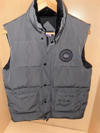 Chaleco acolchado de la marca Canada Goose en color gris. - Cierre de cremallera y botones a presión. - Dos bolsillos frontales con solapa. - Parche circular con logo en el pecho.