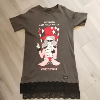 Vestido de la marca Anabel Lee con un diseño llamativo y detalle de encaje. - Estampado frontal con personaje y texto. - Adorno de encaje negro en el bajo. - Manga corta.