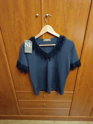 Camiseta de manga corta con un diseño elegante y detalles de pelo. - Cuello en V. - Adorno de pelo en cuello y mangas. - Tejido suave y cómodo.