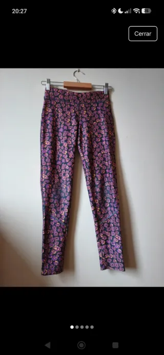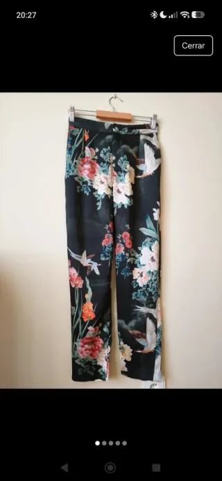 Conjunto de cuatro pantalones con un llamativo estampado floral y de aves. Bershka zara y Crivit - Diseño con fondo negro y motivos multicolor. - Talla XS / 34 / 6.