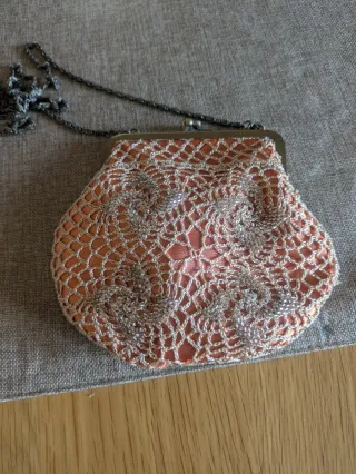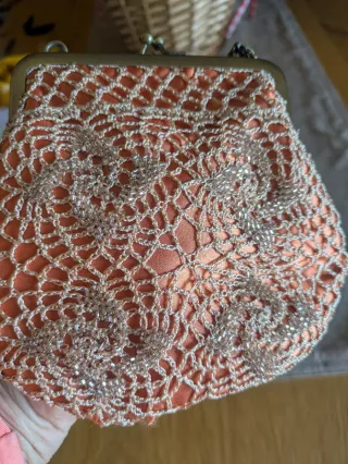 Elegante bolso de mano con un diseño intrincado y detalles brillantes. Perfecto para ocasiones especiales. - Acabado en crochet con adornos plateados. - Incluye una cadena metálica para llevar al hombro. - Cierre de boquilla.