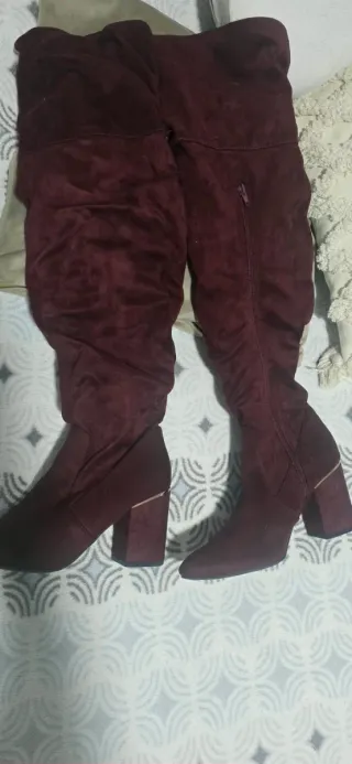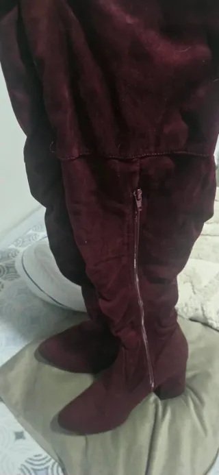 Botas altas de color burdeos, con un diseño que supera la rodilla. Cuentan con un tacón cuadrado y un detalle metálico dorado en la parte trasera del tacón. - Material: Suede sintético. - Cierre: Cremallera lateral. - Tacón: Bloque con detalle dorado.