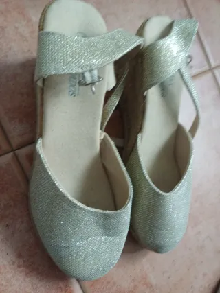 Zapatos de esparto para mujer con un diseño brillante. - Color dorado. - Cierre de pulsera con hebilla. - Plataforma de esparto.