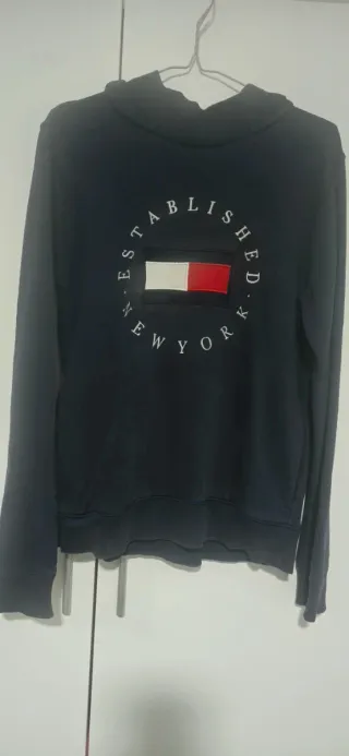 Sudadera con el logo de Tommy Hilfiger. Talla S grande y M pequeña, 176 - Diseño circular con ESTABLISHED NEW YORK alrededor de la bandera. - Bandera icónica de Tommy Hilfiger en el pecho.