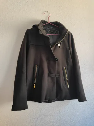 Abrigo corto estilo duffle de Zara. - Cierre de cremallera y botones. - Bolsillos frontales con cremallera dorada. - Capucha. - Talla S. - En muy buen estado. - Envío rápido.