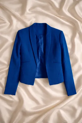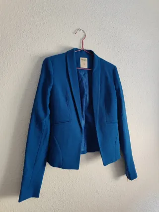 Chaqueta tipo blazer corta con un vibrante color azul eléctrico. Presenta un diseño moderno y elegante, ideal para complementar diversos atuendos. - Corte entallado. - Solapas pronunciadas. - Cierre abierto. #blazer #españa #ropademujer #bershka #enviorapido