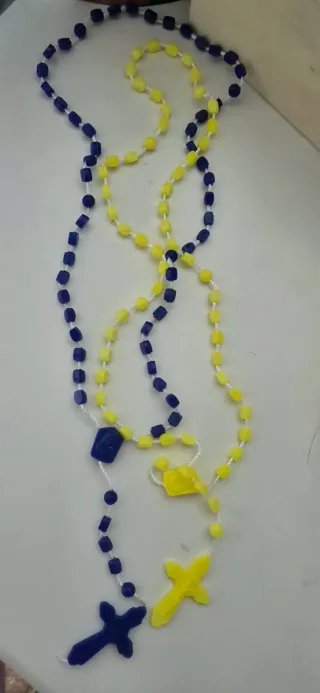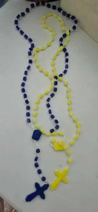 25 rosarios hechos a mano con cuentas de colores. - Un rosario es azul con cuentas rectangulares y una cruz azul. - El otro rosario es amarillo con cuentas rectangulares y una cruz amarilla. - Ambos rosarios tienen cuentas redondas intercaladas y un detalle central.