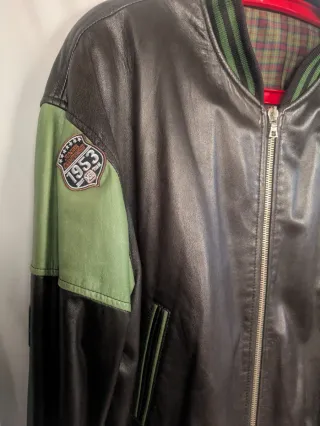 Cazadora estilo bomber con detalles en cuero. - Combinación de cuero negro y verde. - Cuello y puños con ribete a rayas. - Forro interior a cuadros. - Cremallera frontal.