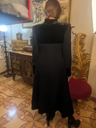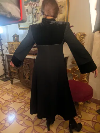Elegante abrigo largo con detalles en terciopelo. - Diseño de cuello alto. - Mangas acampanadas con puños de terciopelo. - Corte entallado en la cintura. - Falda amplia.