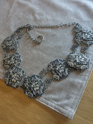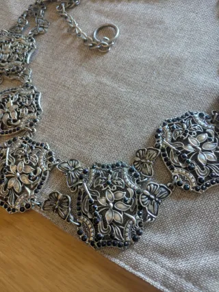 Elegante cinturón con un diseño intrincado y detalles en pedrería. - Diseño floral y de mariposas. - Acabado metálico plateado. - Abalorios negros incrustados.