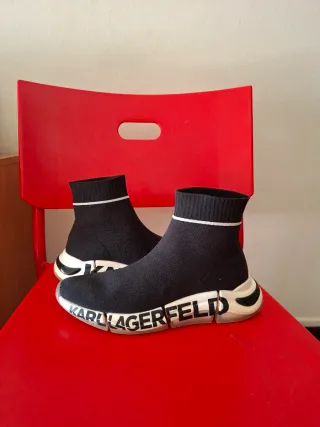 Botines de elástico Karl Lagerfeld en color negro con detalles blancos. - Diseño tipo calcetín. - Suela con logo de la marca. - Detalle de líneas blancas en el cuello.
