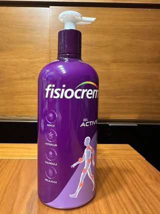 Gel Fisiocrem Active en formato bote de 600 ml. - Contiene extractos de Arnica, Hypericum, Calendula y Melaleuca. - Ilustración de figura humana con puntos de dolor. - Dispensador tipo pump.