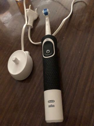 Cepillo dental eléctrico con cargador. - Mango con diseño ergonómico. - Cabezal de cepillo con cerdas. - Base de carga blanca.
