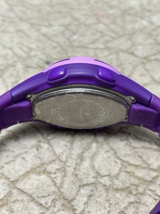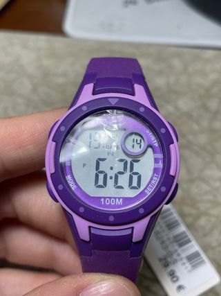 Reloj deportivo en color morado. Resistente al agua hasta 100 metros. - Diseño moderno y juvenil. - Correa de silicona. - Pantalla digital. - Plástico resistente a golpes - Nuevo pero SIN GARANTÍA Pregunta sin compromiso