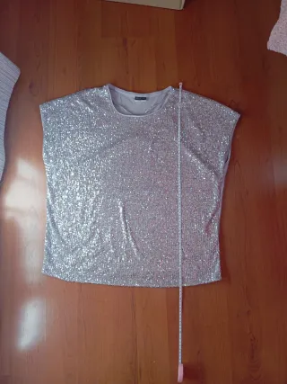Top brillante con lentejuelas plateadas. Un básico para añadir un toque festivo a cualquier look. - Diseño con lentejuelas. - Manga corta.
