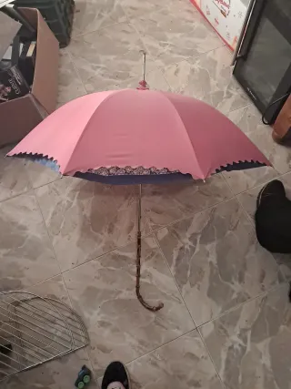 Paraguas de estilo vintage con un diseño elegante. - Color principal rosa con detalles interiores en azul. - Adornado con un borde de encaje. - Mango curvo con textura.