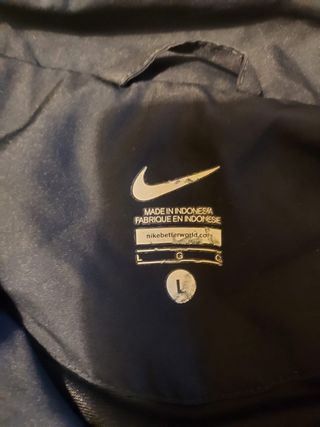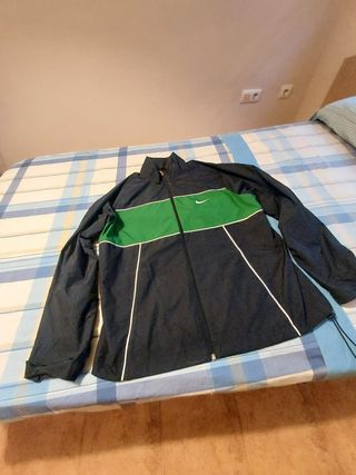 Chaqueta cortavientos con diseño deportivo. - Color principal negro con banda verde. - Logo de Nike visible. - Cierre de cremallera frontal. - Puños y bajo ajustables.
