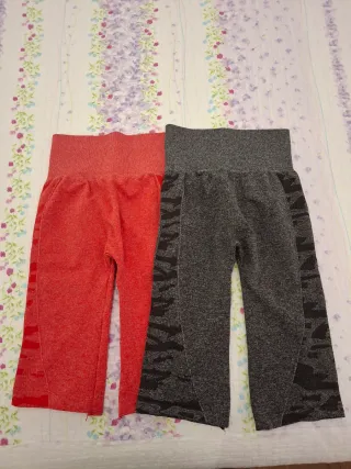Conjunto de mallas deportivas de corte capri, una en color gris y otra en rojo. Ambas presentan un diseño con estampado de camuflaje en los laterales. - Diseño sin costuras. - Cintura alta elástica.