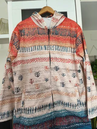 Abrigo con capucha y estampado étnico, totalmente nuevo. - Diseño multicolor con tonos naranjas. - Cierre de cremallera. - Bolsillos laterales. - Su precio fue de 49.99€. - No es de Shein ni Temu. - Marca de calidad.