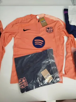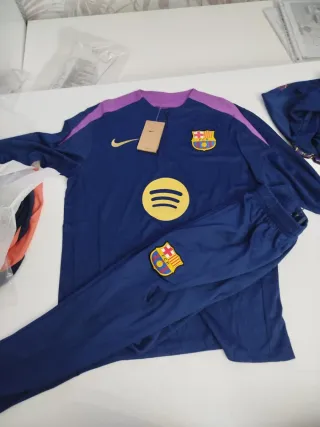 Conjunto deportivo del FC Barcelona. - Camiseta de manga larga. - Pantalón largo. - Escudo del FC Barcelona. - Logo de Spotify.