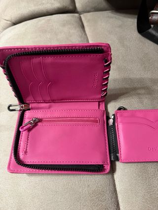 Pequeña cartera de la marca Desigual con un diseño abstracto y colorido. - Acabado en piel sintética. - Detalle de costuras en contraste. - Cierre de clip.