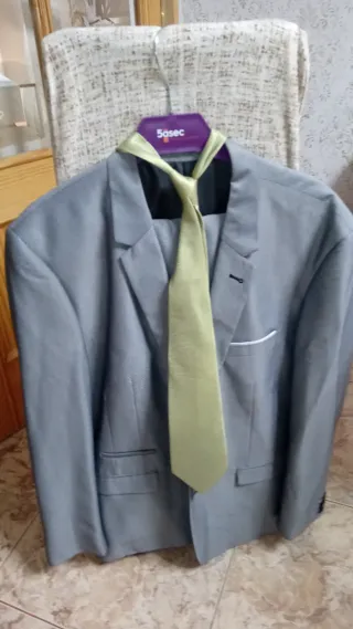 Conjunto de traje elegante. - Chaqueta de traje gris. - Corbata de color verde.