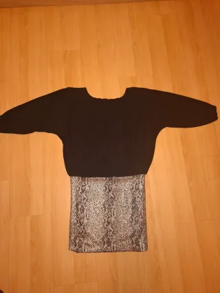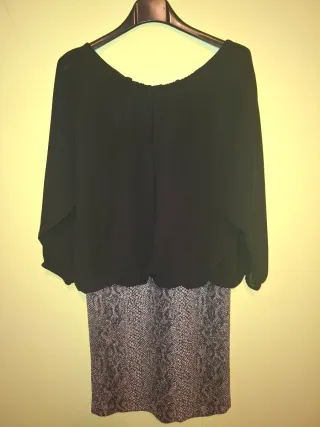 Vestido de fiesta con un diseño elegante. - Parte superior de gasa negra con escote - Falda de licra con estampado de serpiente en tonos grises.